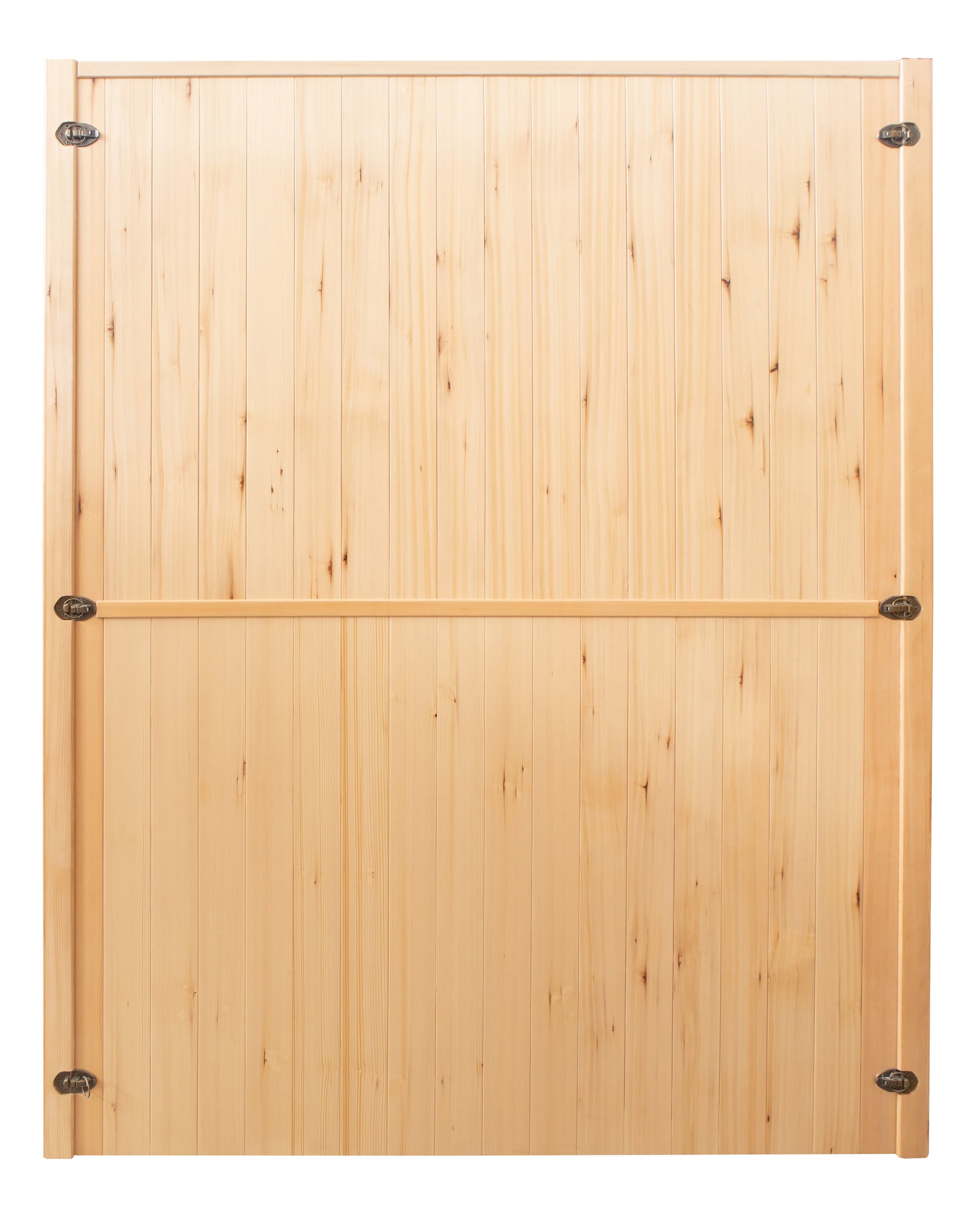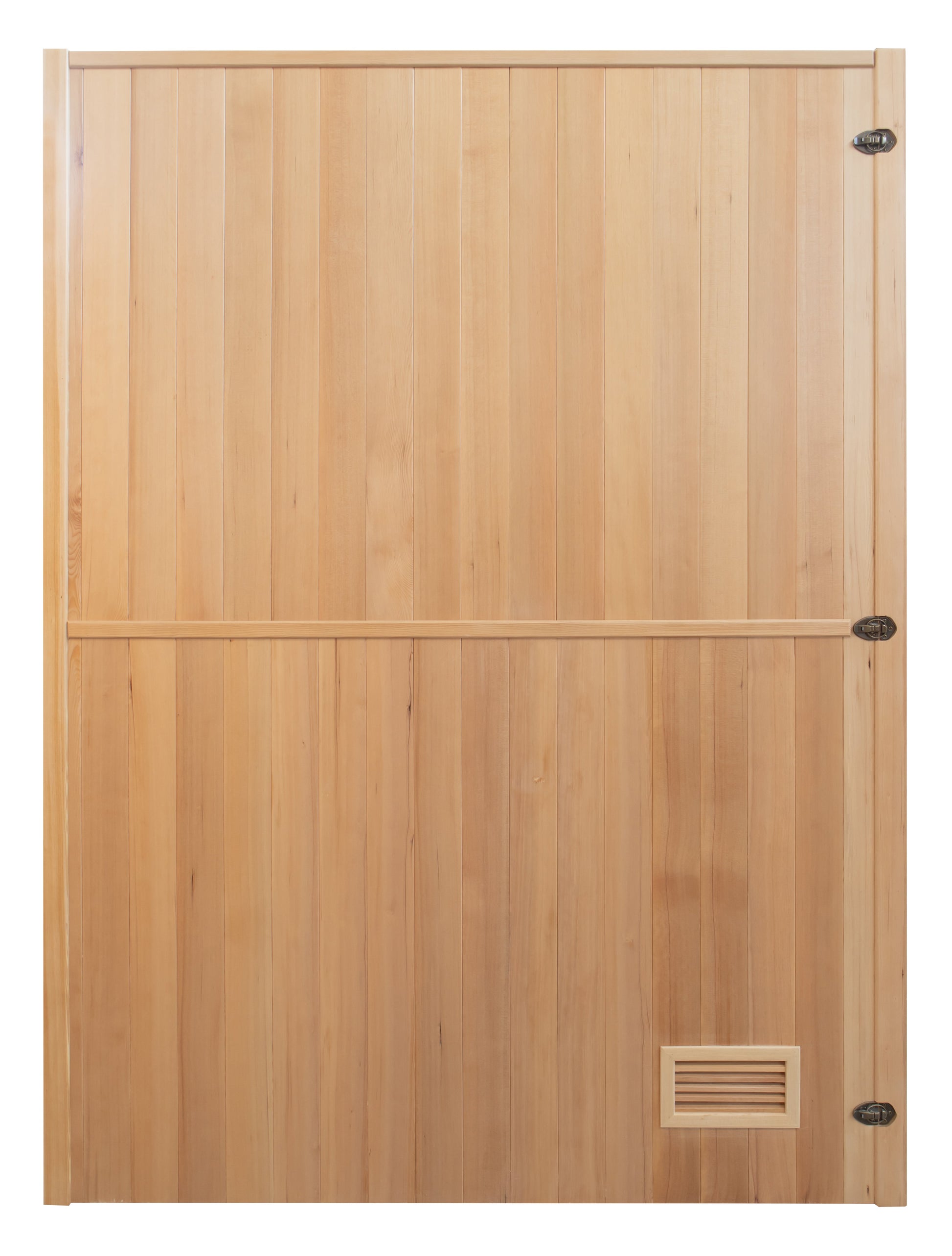 Den stora glasfronten i 8 mm säkerhetsglas skapar en känsla av rymd och frihet samtidigt som den ger bastun ett exklusivt uttryck. Konstruktionen med tre massiva träväggar och helglasad front ger en unik visuell upplevelse.