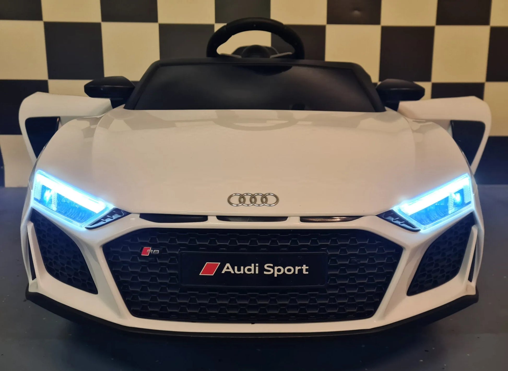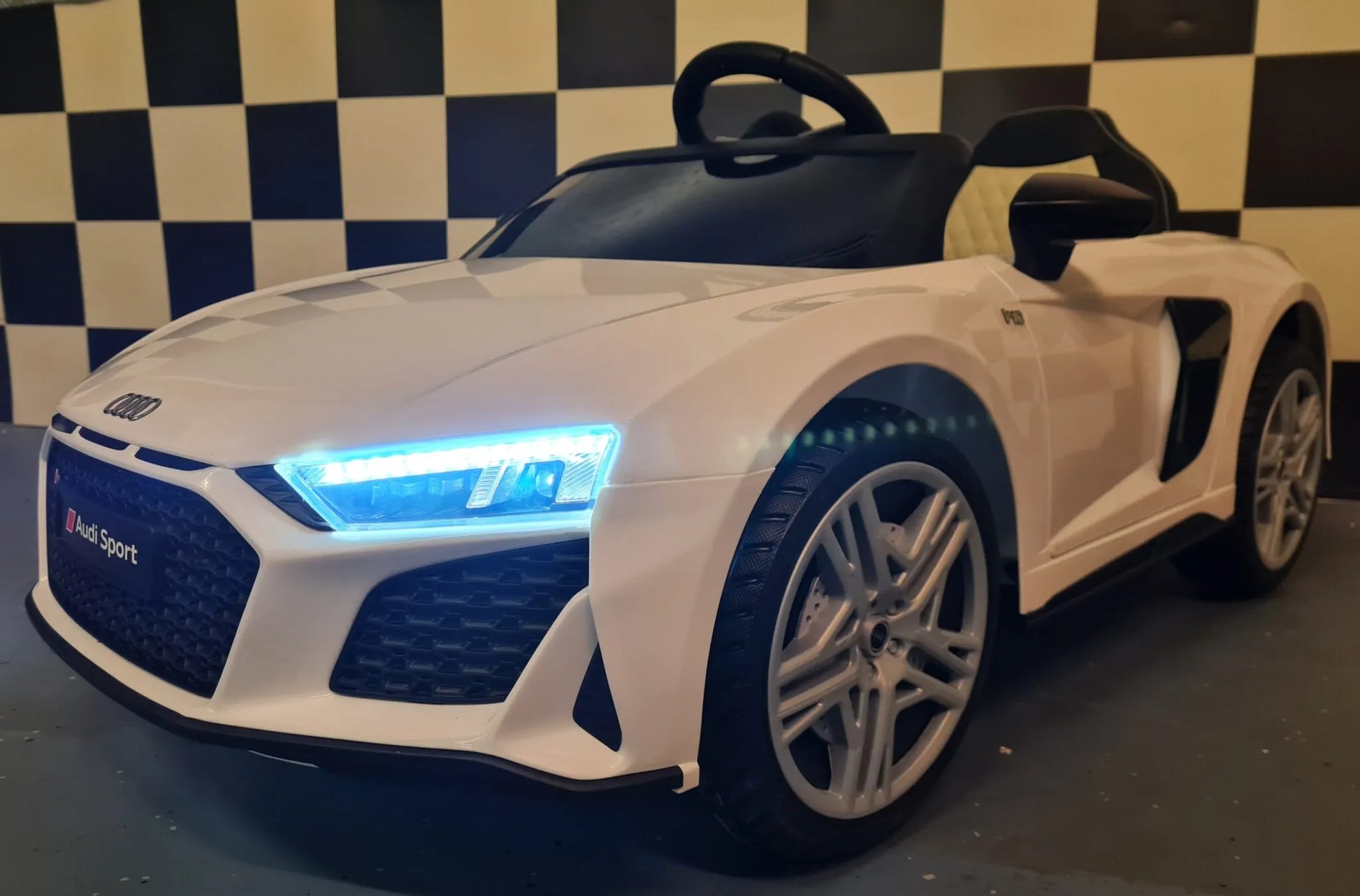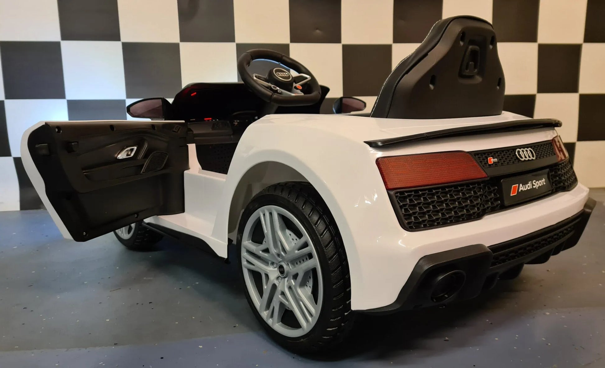Denna elektriska barnbil Audi R8 batteribarnbil är lämplig för barn i åldern 3 år (för användning av små komponenter), och är försedd med till exempel lädersäte, gummidäck och faktiskt öppningsbara dörrar.