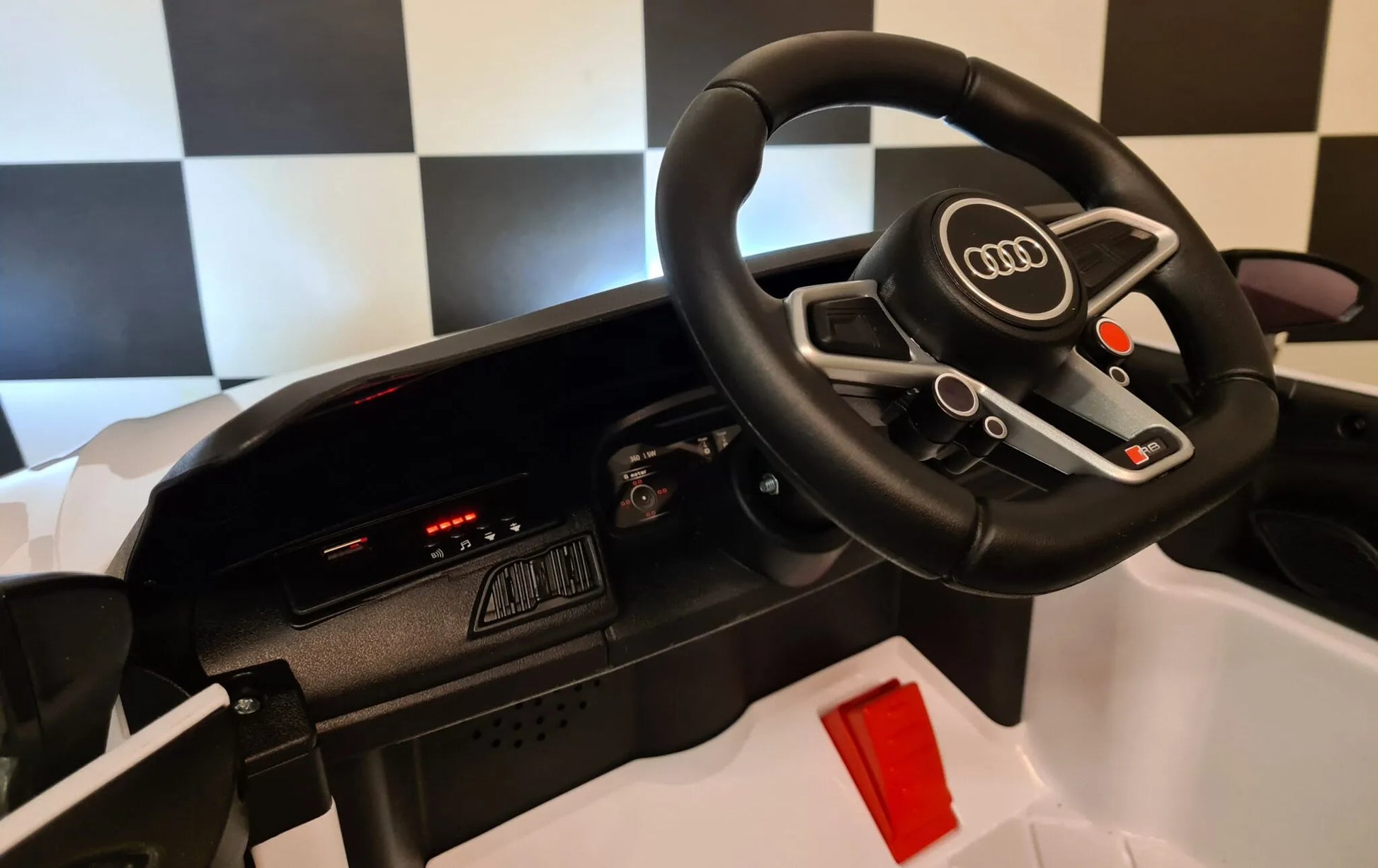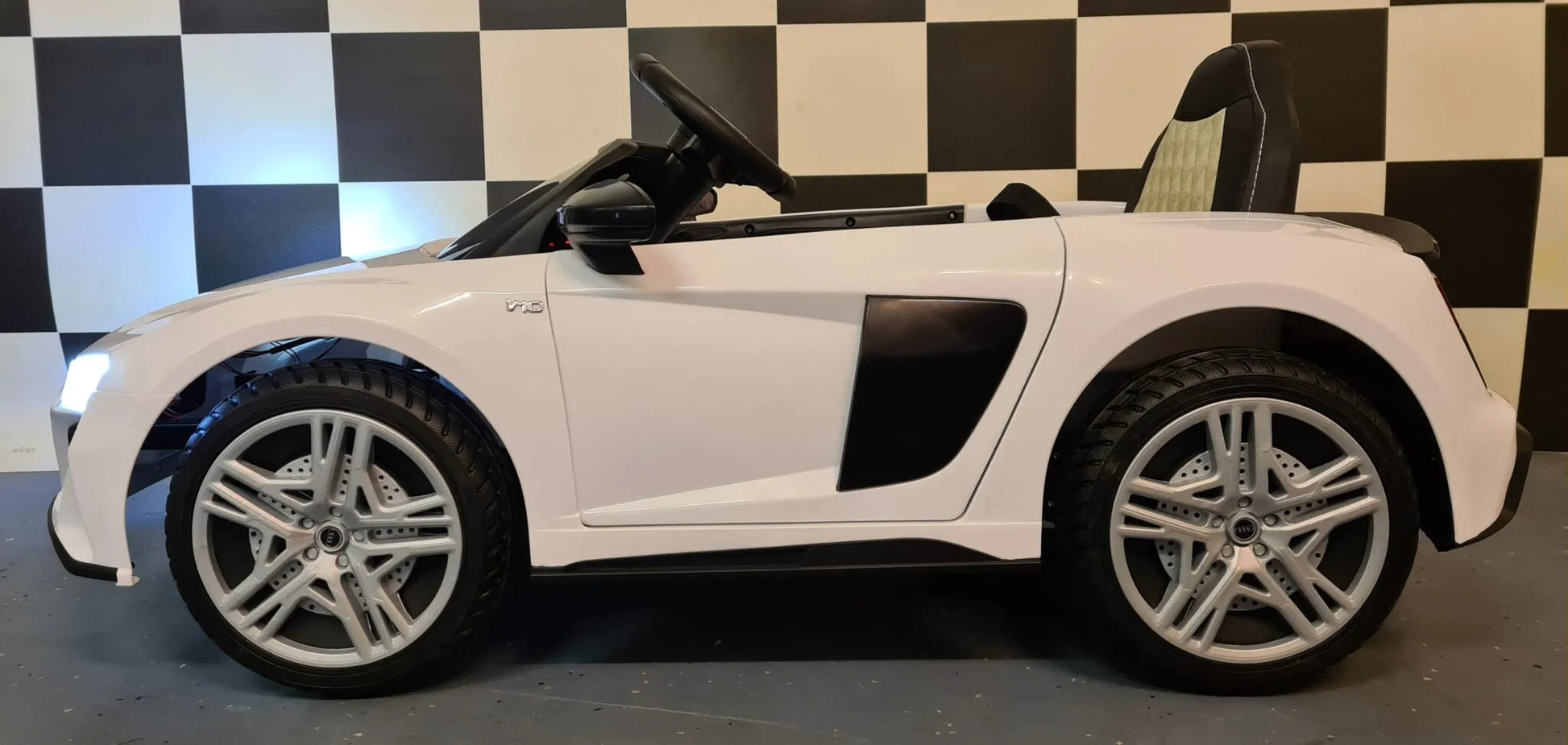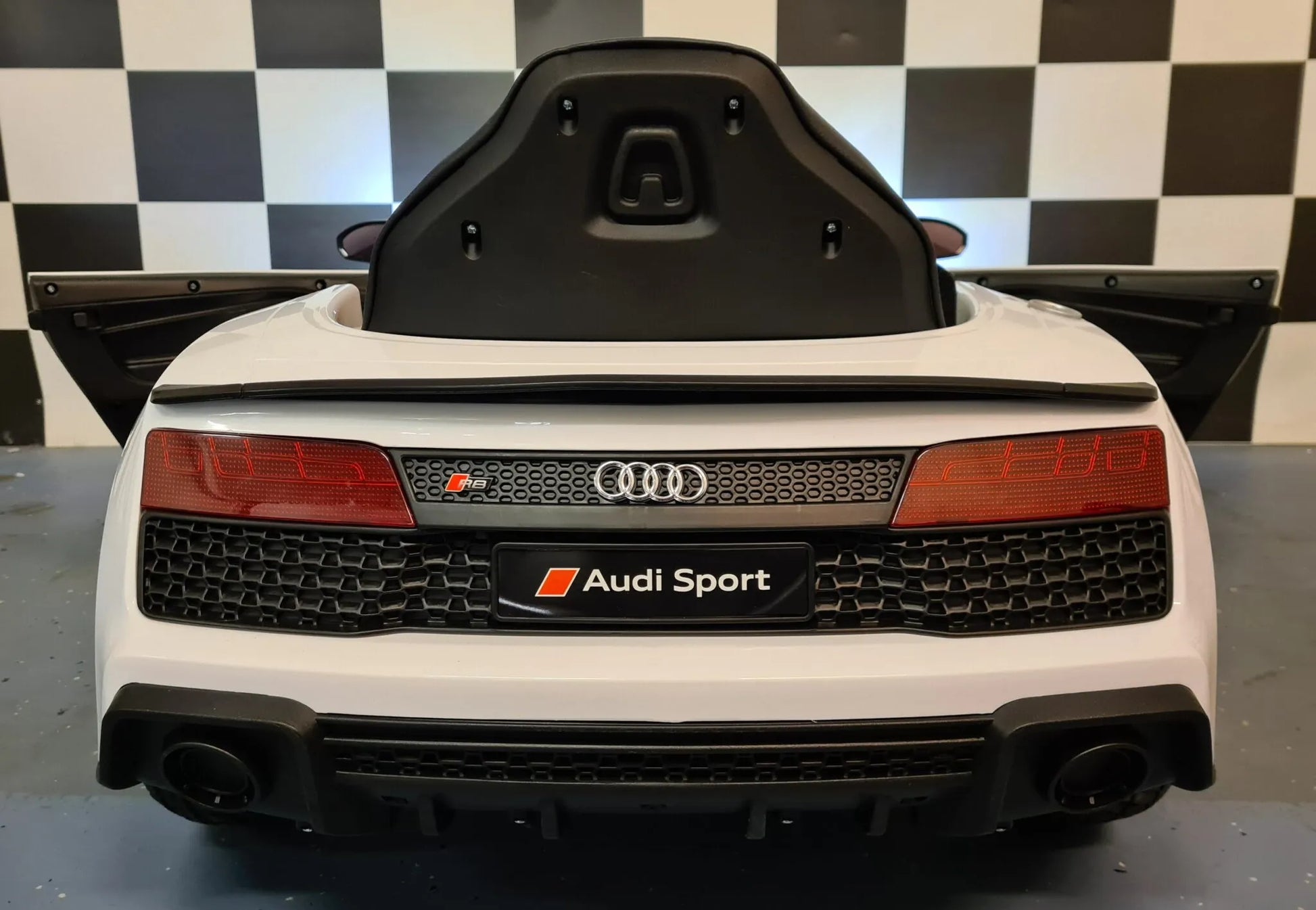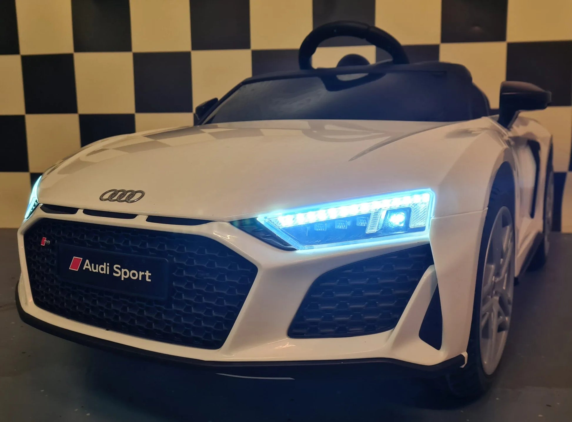 Denna elektriska barnbil Audi R8 batteribarnbil är lämplig för barn i åldern 3 år (för användning av små komponenter), och är försedd med till exempel lädersäte, gummidäck och faktiskt öppningsbara dörrar.