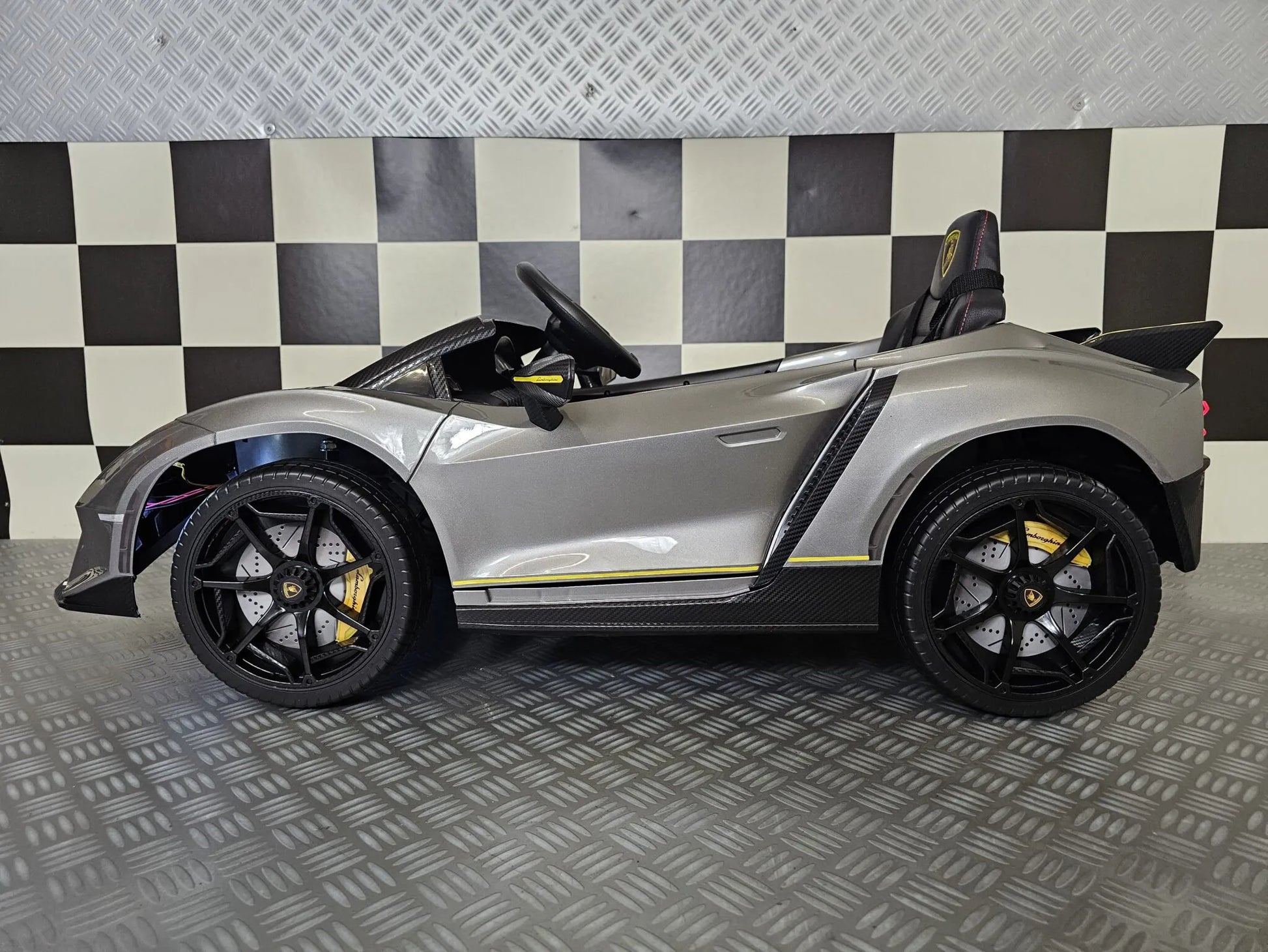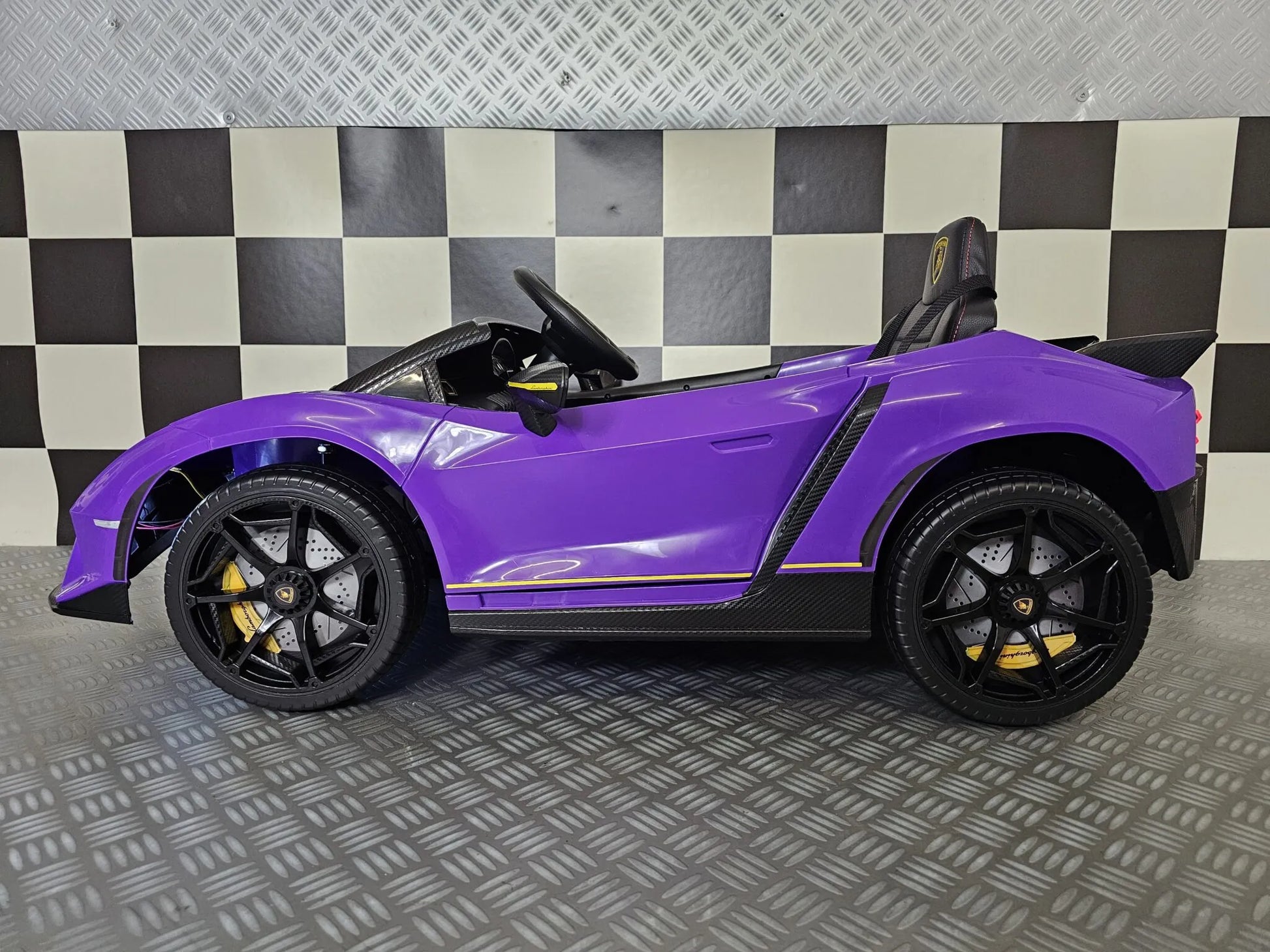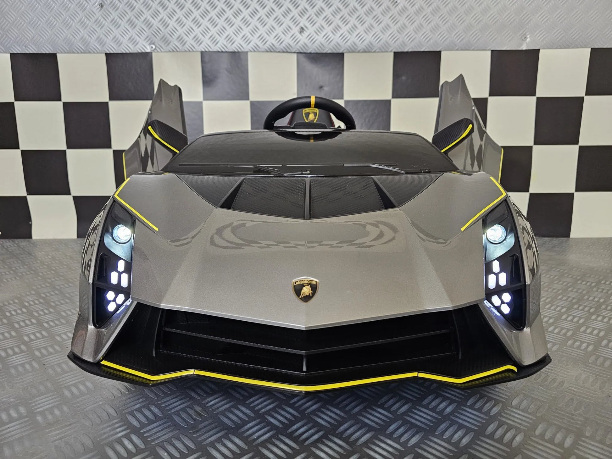 Denna Lamborghini barnbil är utrustad med 2,4G fjärrkontroll, gummidäck och lädersäte. Lämplig för barn från 3 år (på grund av användningen av små delar)