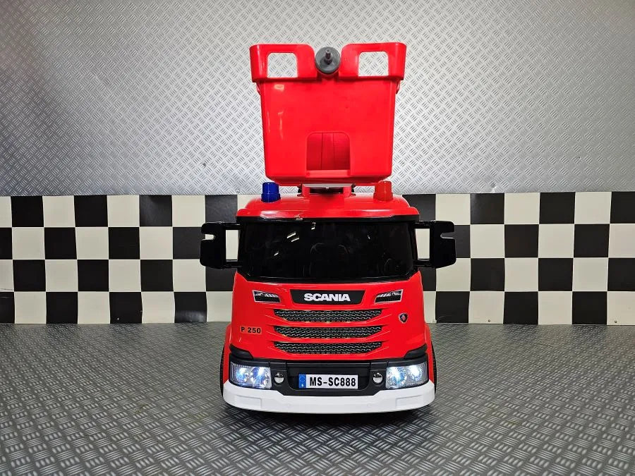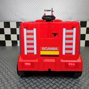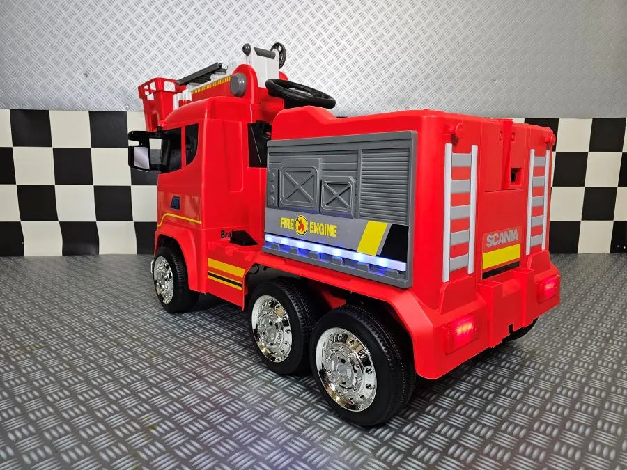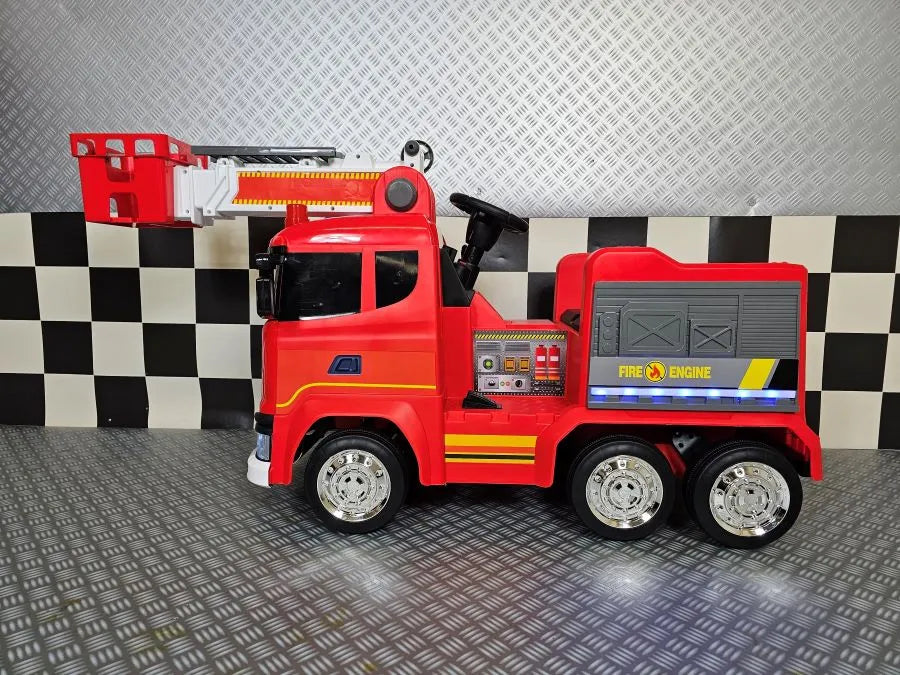 Denna robusta 12-volts brandbarnbil kommer med lädersäte, blinkande ljus, vattentank/vattenspray och till och med en brandleksakshjälm! Passar från ca 3 år.
