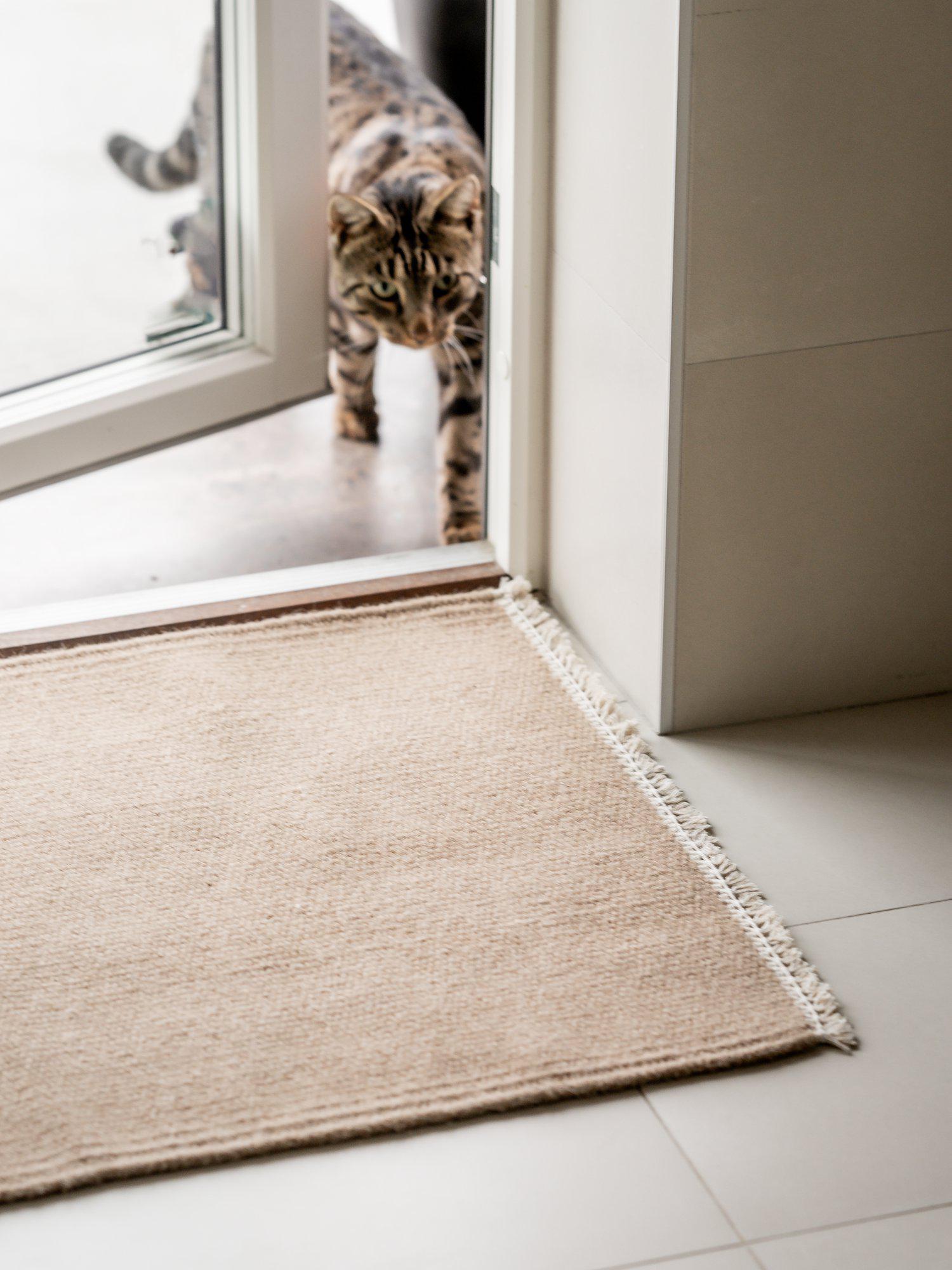 John är en tunn slätvävd, vändbar ullmatta med bomullsvarp och en kort frans på båda kortsidorna. Ull är ett naturligt material och en förnybar fiber, ull är en stark fiber och är känd för sin hållbarhet och långa livslängd. Ull har en naturlig smuts- och vattenavvisande förmåga och lämpar sig därför mycket bra som material i en matta. Mattan kan fälla till en början, något som avtar med tiden och allt eftersom mattan används. Skaka mattan regelbundet för att få bort damm eller smuts och vädra den då och då. Rengör eventuella fläckar med fuktig trasa eller lämna för fackmannamässig mattvätt. Mått 170x240cm. Denna mattan är ett hantverk och vissa avvikelser och ojämnheter i väven kan förekomma.