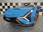 Denna Lamborghini Sian barnbil är bland annat försedd med fram- och bakljus, gummidäck och ett lädersäte. Lämplig för barn från 3 år (på grund av små delar).