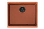 Lerfärgad kompositho kompletteras med svarta detaljer: ett svart bräddavlopp, en svart korgbottenventil och en svart silkopp. Hoarna har en smal kant, vilket ytterligare förstärker den eleganta helheten.