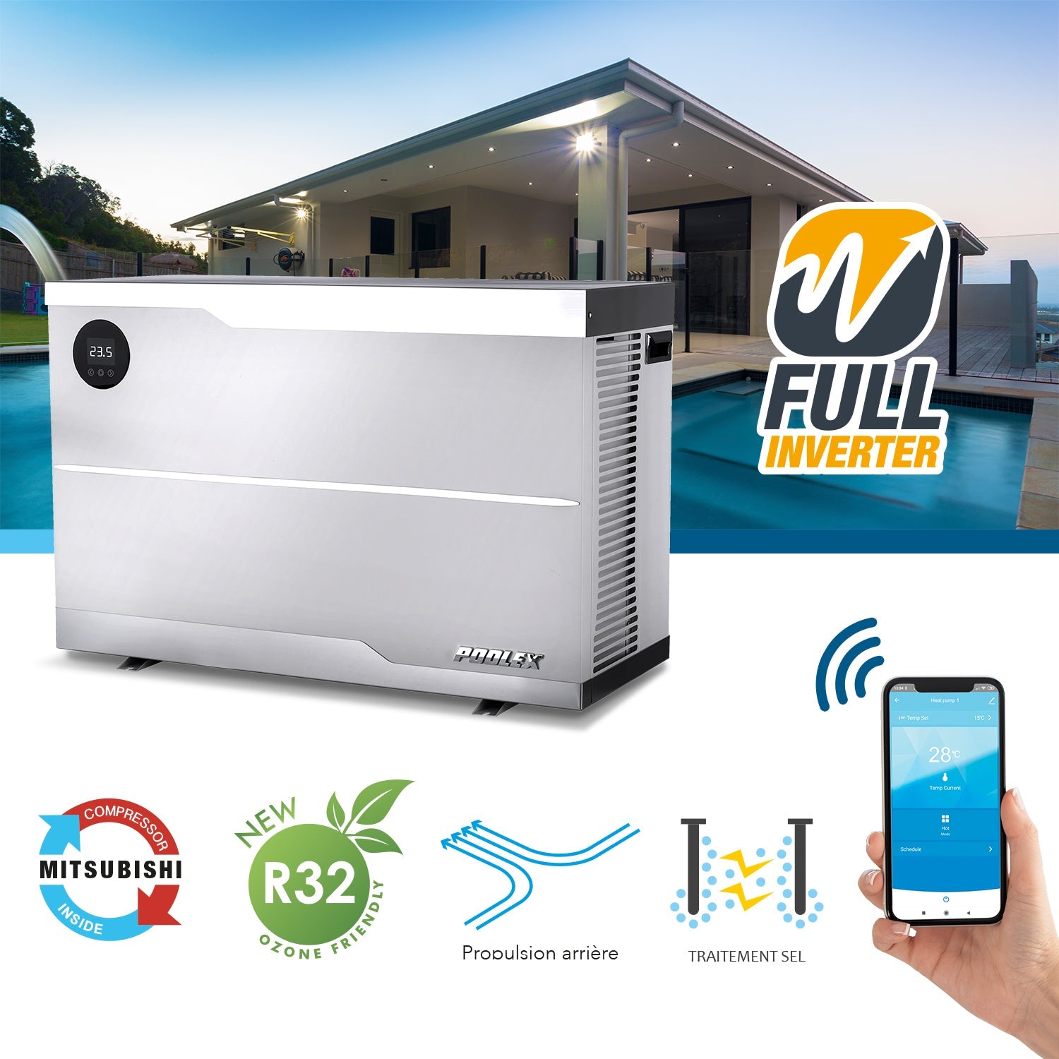 Full Inverter innebär att värmepumpen inte behöver gå på full effekt och sedan stanna. I stället startar den mjukt och arbetar kontinuerligt med anpassad effekt för att nå och hålla din inställda temperatur. Det minskar toppar i elförbrukning, sänker ljudnivån och ger en mer stabil badtemperatur.