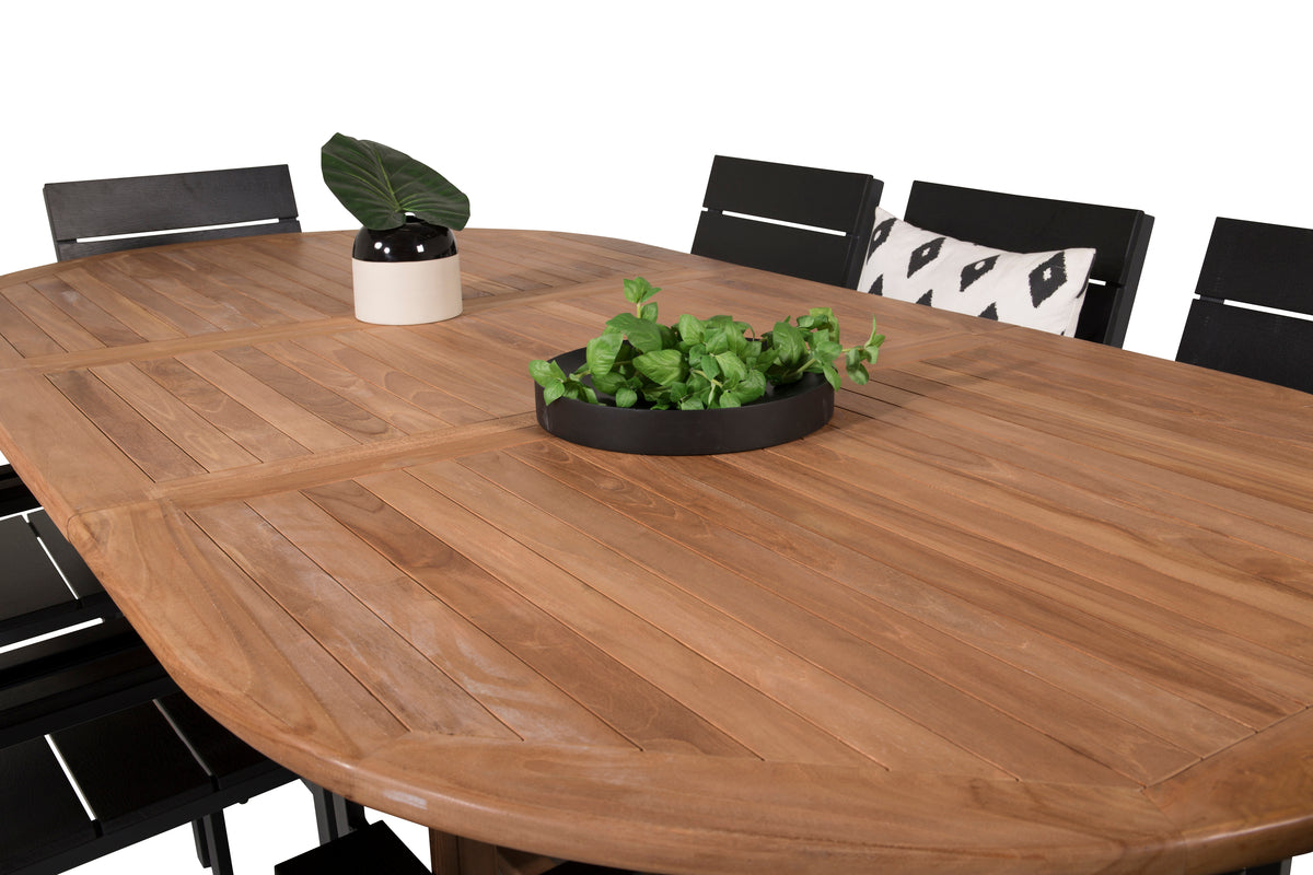 Skapa ett modernt blickfång på din uteplats! Vårt ovala matbord Kenya i smakfull teak imponerar med sin lyxiga utformning och skandinaviska design. Bordsskivan har ett ribbat utförande och stommen ger ett stadigt intryck. Mått: 180/240x120 cm. Här i smäcker kombination med 8st stapelbara matstolar från serien Levels. Stolen är ribbad i svart aintwood och har en rak ram av aluminium. Bjud in till många sociala stunder i sommar!
