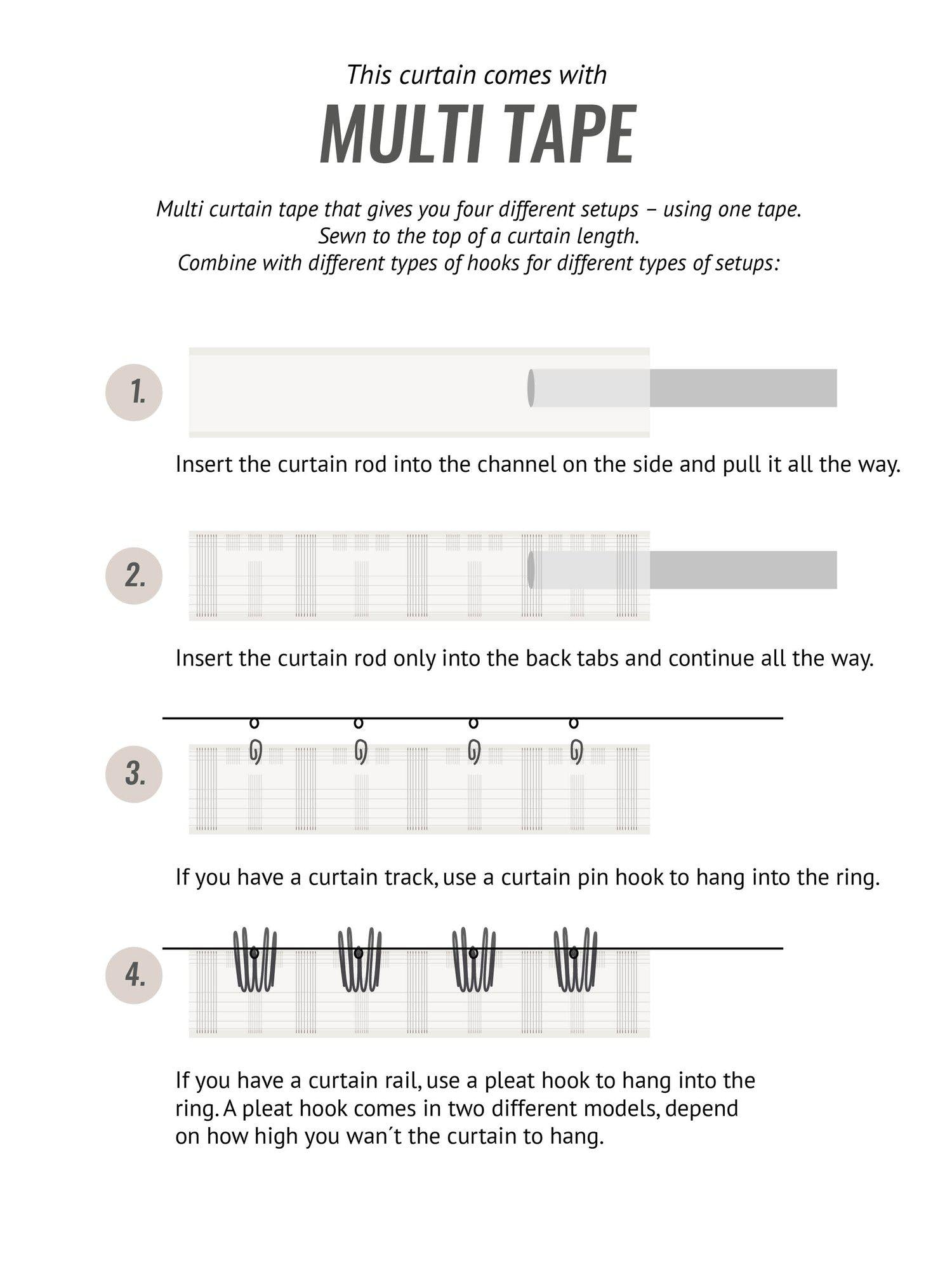 Multiband innebär att gardinen kan hängas upp på flera olika sätt: direkt i hällorna eller med hjälp av fingerkrokar och ringar på stången. Det spelar ingen roll vilken typ av gardinstång du har, multibandet fungerar till allt.