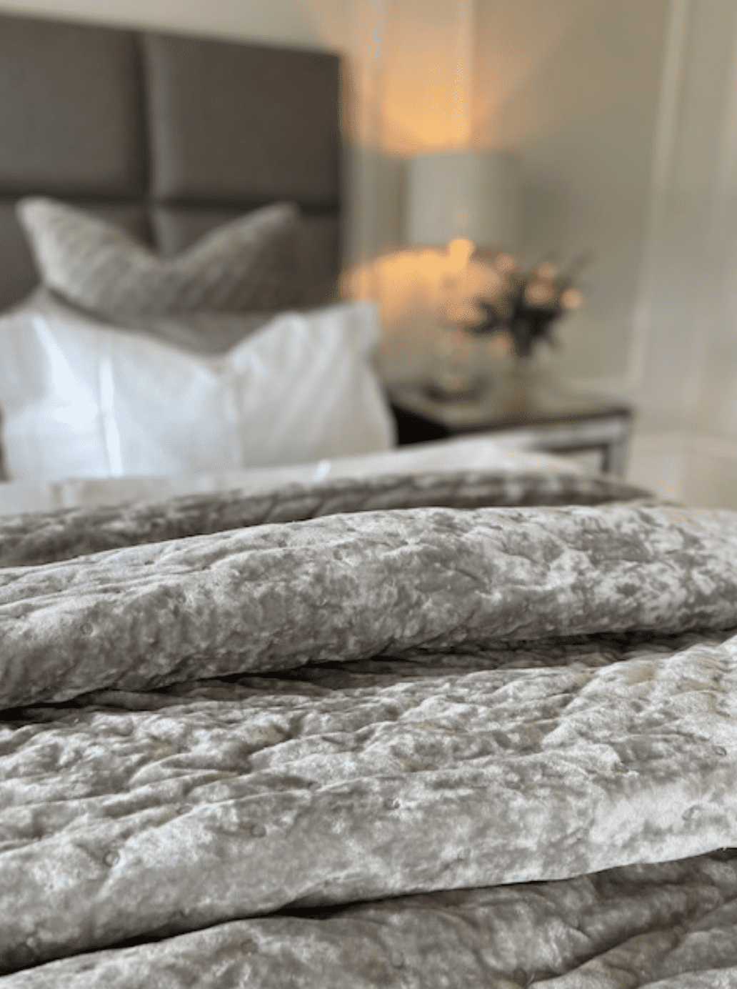 Quiltat sammetsöverkast Cia med broderade prickar. Passar för enkelsäng eller nertill på en dubbelsäng. Storlek 180x260. Produkten är certifierad enligt STANDARD 100 by OEKO-TEX®. Certifieringen garanterar att produkten är testad och fri från ämnen som kan vara skadliga för hälsan och miljön.